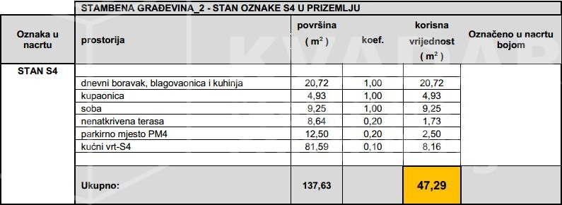 U ponudi je stan S4 smješten u objektu 2, ukupne površine 137,63 m2, uračunat je vrt vrt od 81,59 m2 i jedno parkirno mjesto. Stan se nalazi u mirnoj, slijepoj ulici koja pruža privatnost i ugodan život u zelenom okruženju.