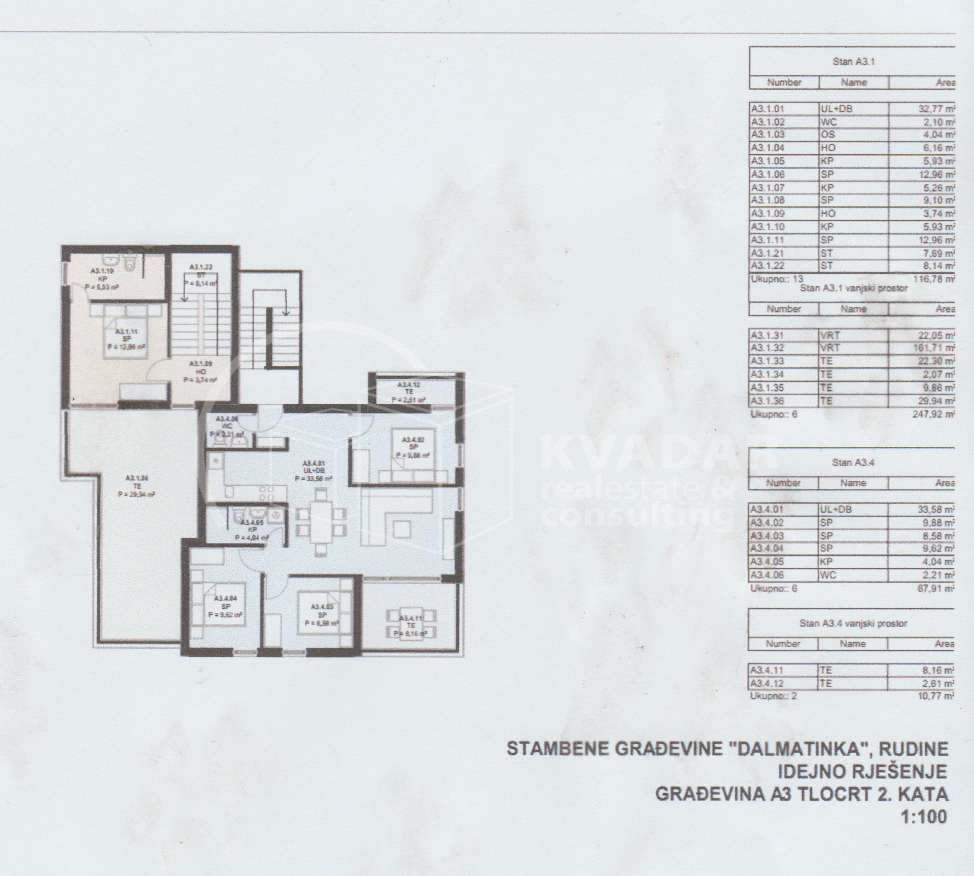 Ovaj sadržajni, odlično organizirani stan je smješten u jednom od 4 objekta novog projekta Dalmatinka pod oznakom A3, koji prvi kreće u realizaciju na vrlo atraktivnoj lokaciji - Rudine - Kaštel Novi, oko 900m iznad Kaštelanske brze ceste, odakle se pruža veličanstven pogled na Kaštelanski zaljev, Split i Trogir te okolni akvatorij. U neposrednoj blizini se nalazi trgovina, restorani, crkva, a uskoro će biti izgrađena osnovna škola, pa je ova lokacija u mirnom okruženju vrlo ugodna za stanovanje.
