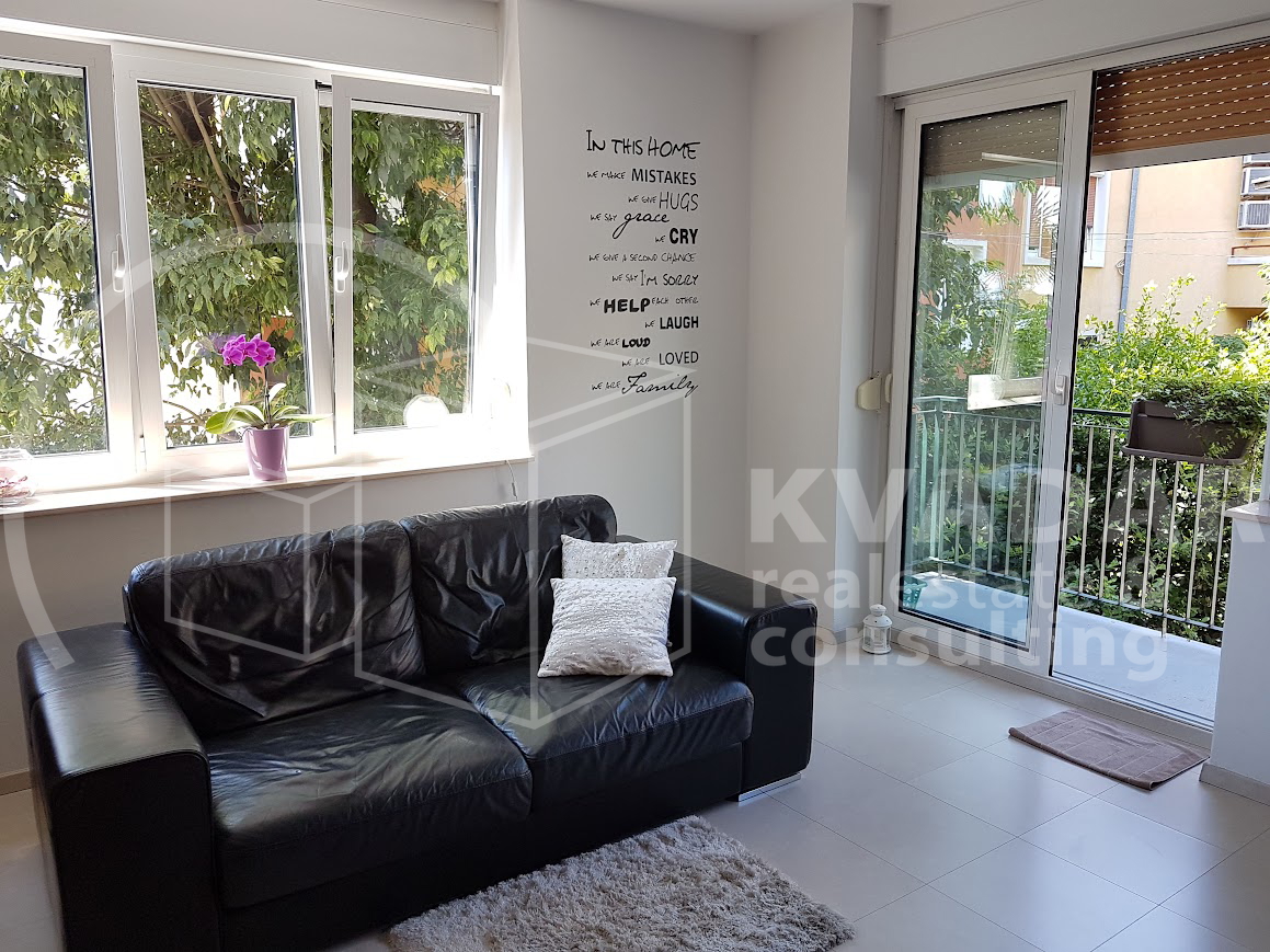Stan se nalazi na 1. katu vrlo uredne i mirne zgrade od ukupno 3 kata, s krovnom terasom koja je dostupna za korištenje svim stanarima a s koje se pruža pogled na cijeli Kvarner i more. Vrlo mirna lokacija okružena zelenom površinom koja isključivo pripada zgradi. 2025 g, obnovljena je fasada zgrade što povećava energetsku efikasnost.Stan je kompletno uređen, adaptiran 2005 g.te opremljen odabranim kvalitetnim materijalima i namjestajem koji je ukljucen u cijenu.