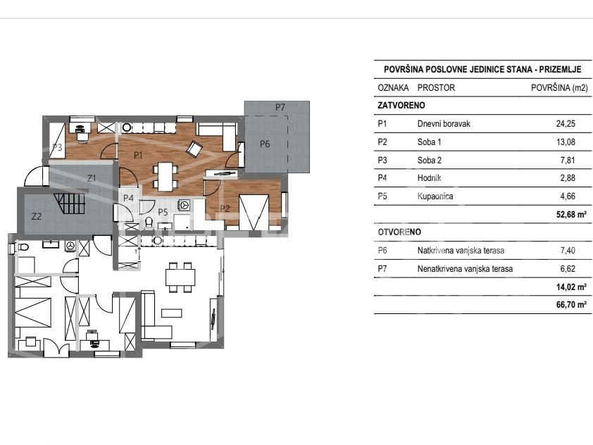 Stan obračunske površine 60,54m2 (neto korisne površine 66,70 m2).