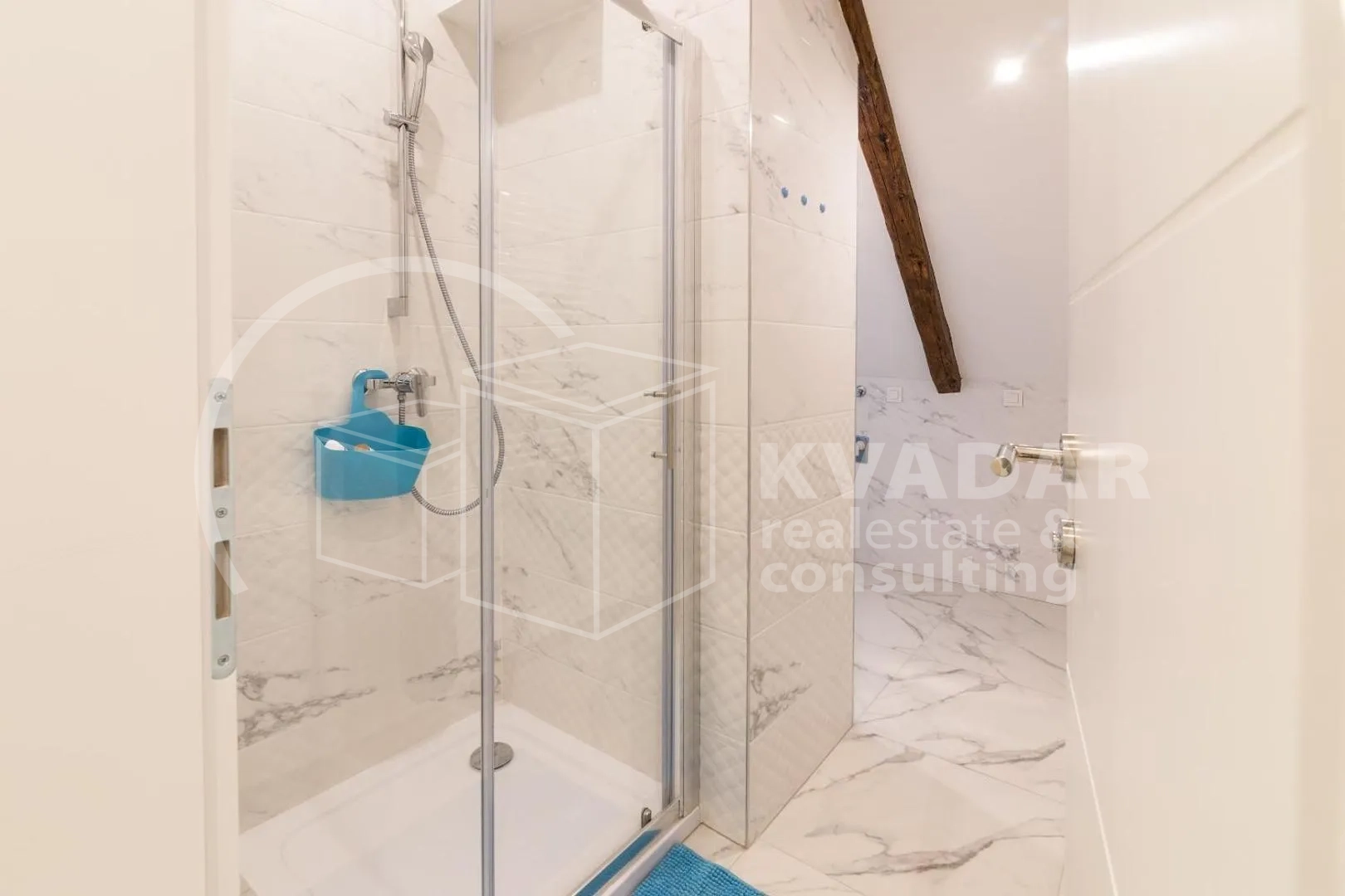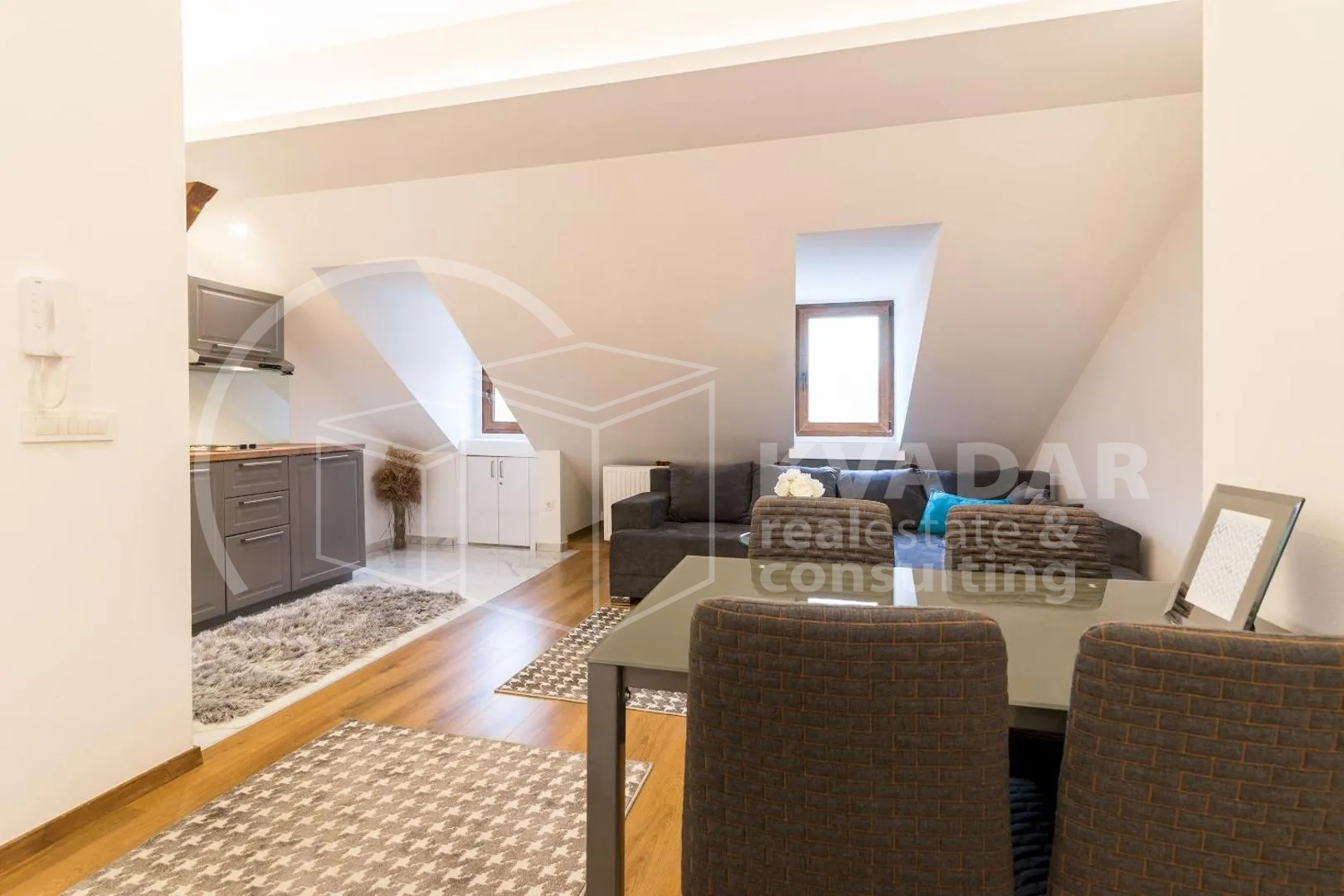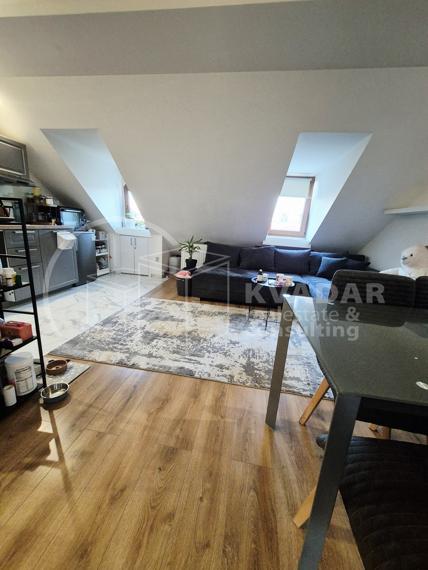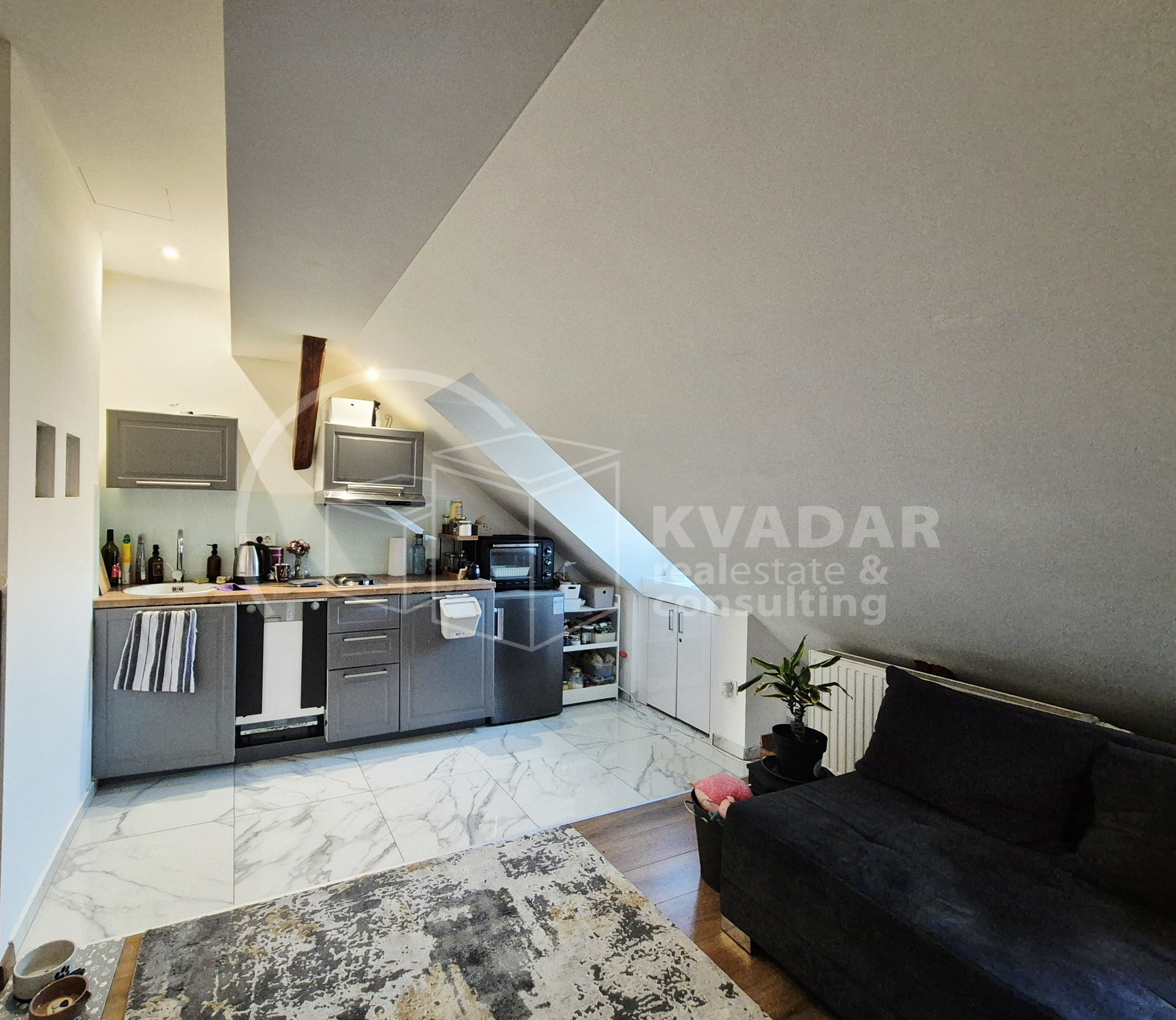 Stan je u potkrovlju zgrade bez lifta, površine 72m2 (podno 87m2) i organiziran je kao dvije potpuno odvojene stambene jedinice, sa kompletno opremljenim kuhinjama i kupaonicama. Veća stambena površina ima i zasebnu spavaću sobu. Oba stana su trenutno u najmu.