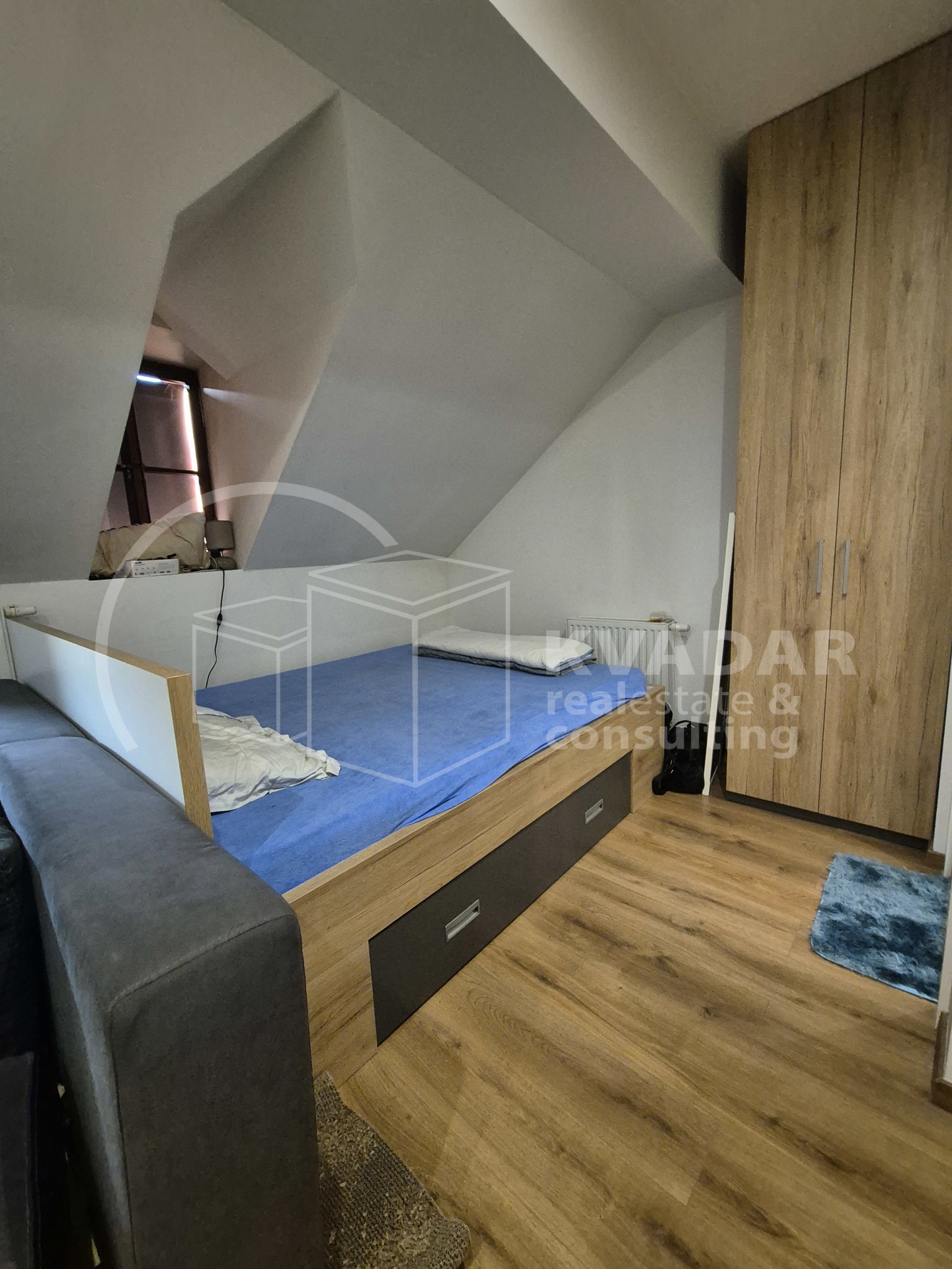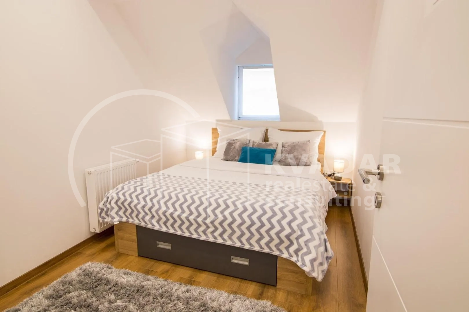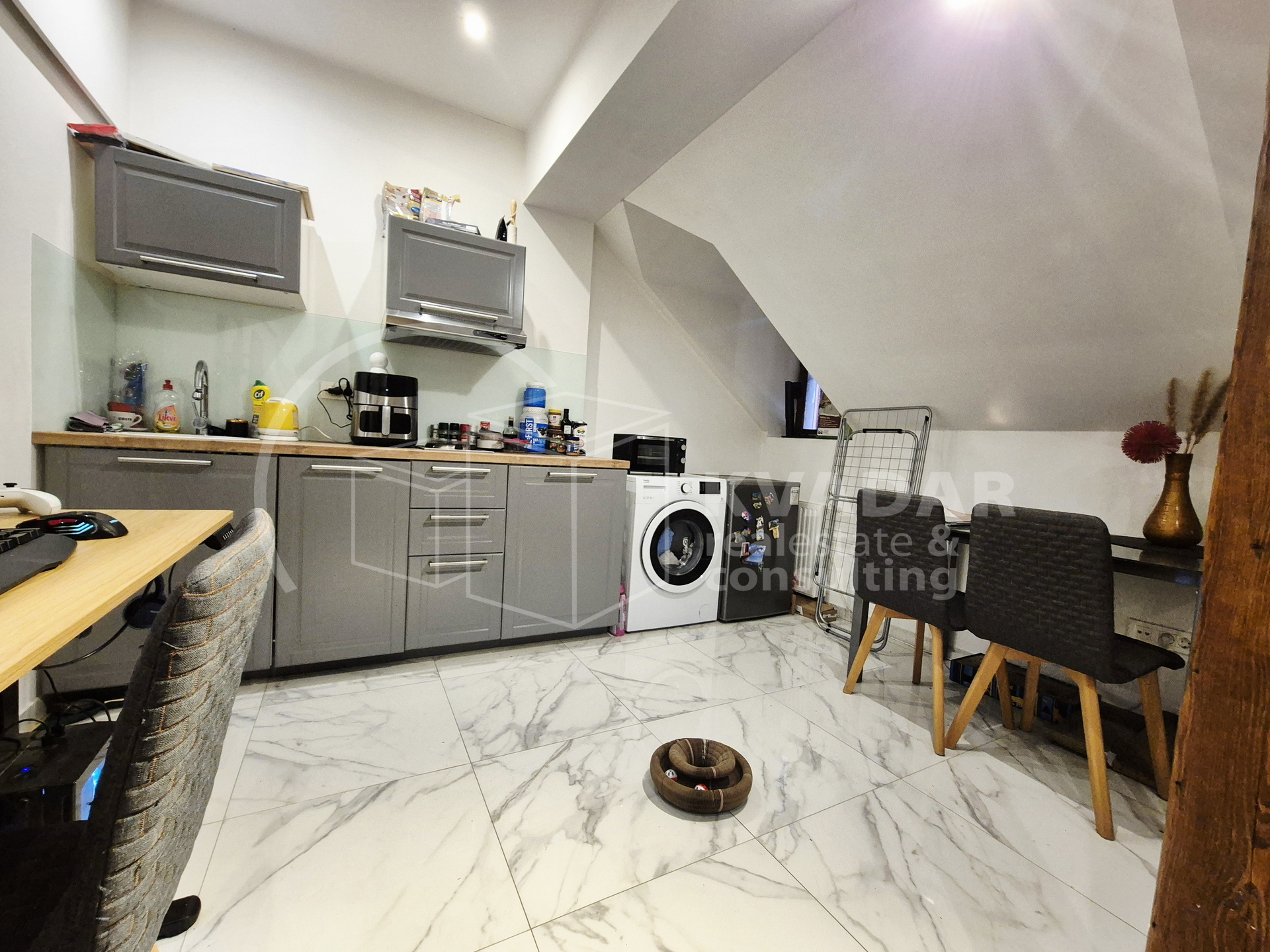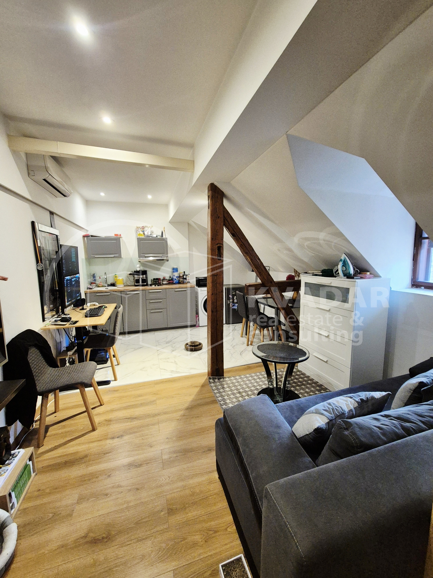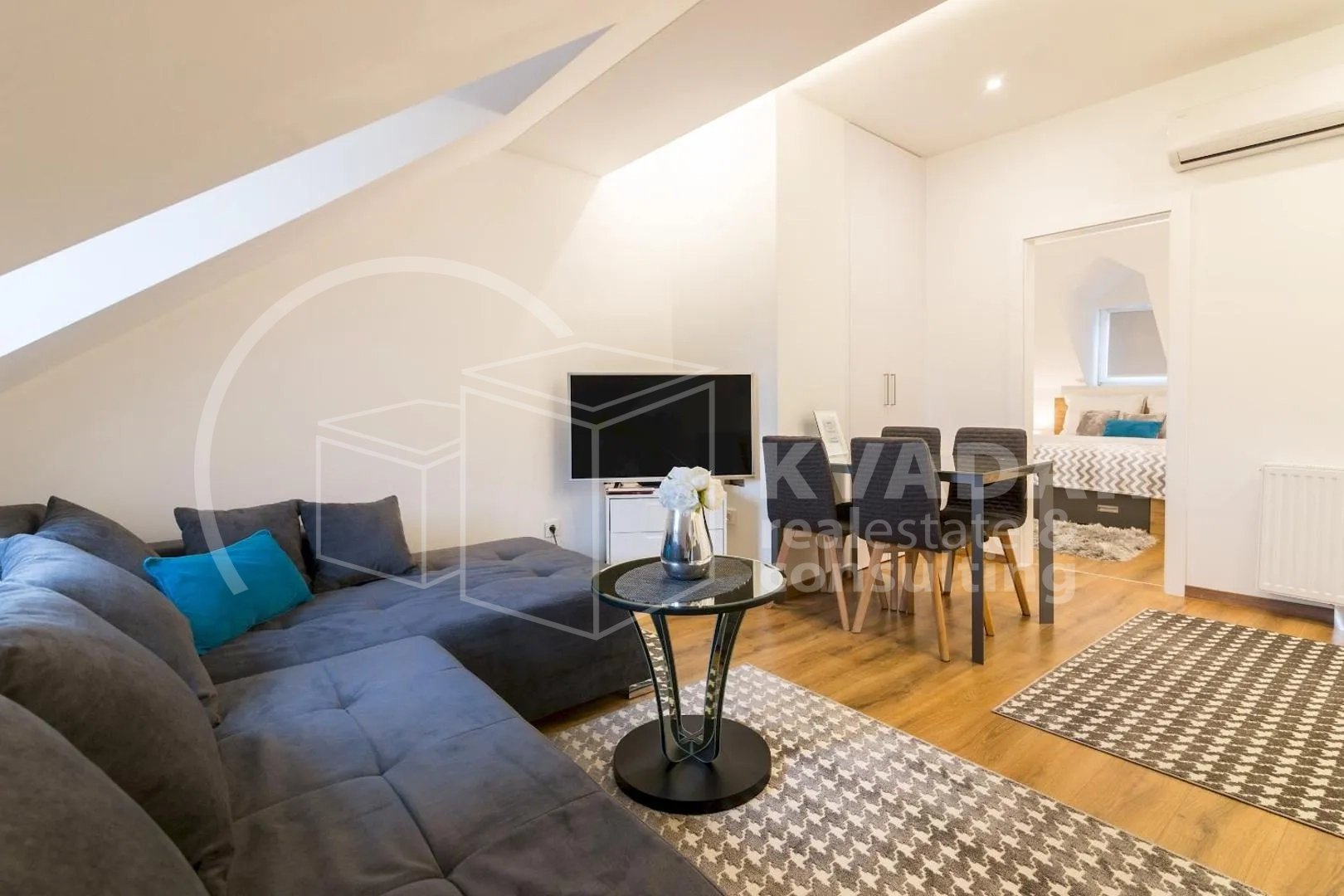 Stan je u potkrovlju zgrade bez lifta, površine 72m2 (podno 87m2) i organiziran je kao dvije potpuno odvojene stambene jedinice, sa kompletno opremljenim kuhinjama i kupaonicama. Veća stambena površina ima i zasebnu spavaću sobu. Oba stana su trenutno u najmu.