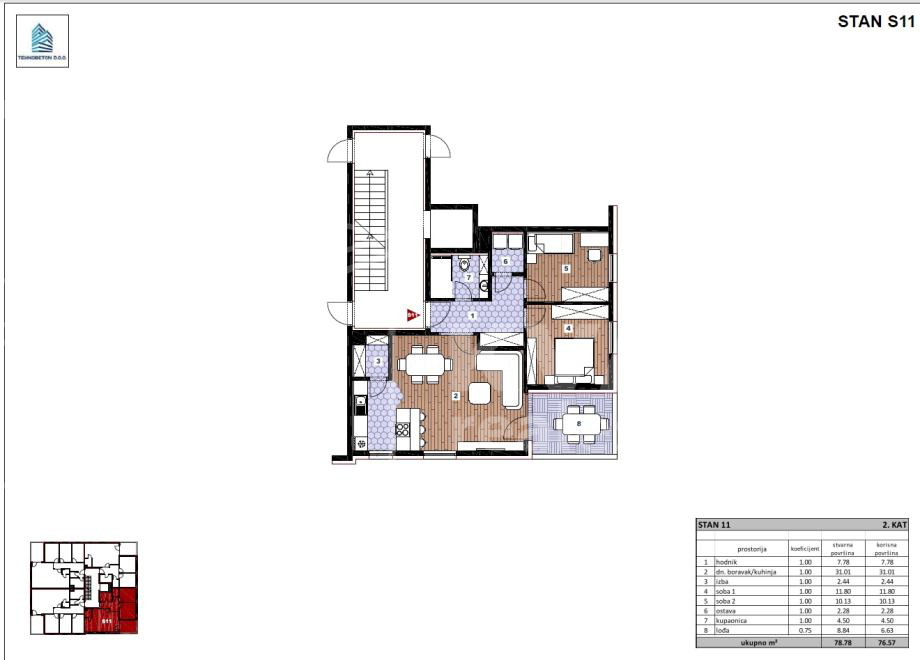 Ukupna stvarna površina stana iznosi 78,78 m2, dok obračunska površina iznosi 76,57 m2.