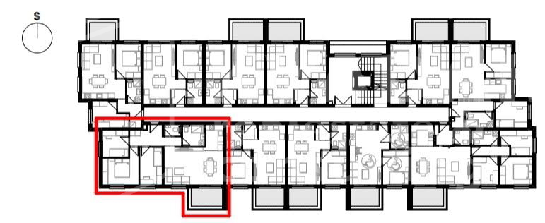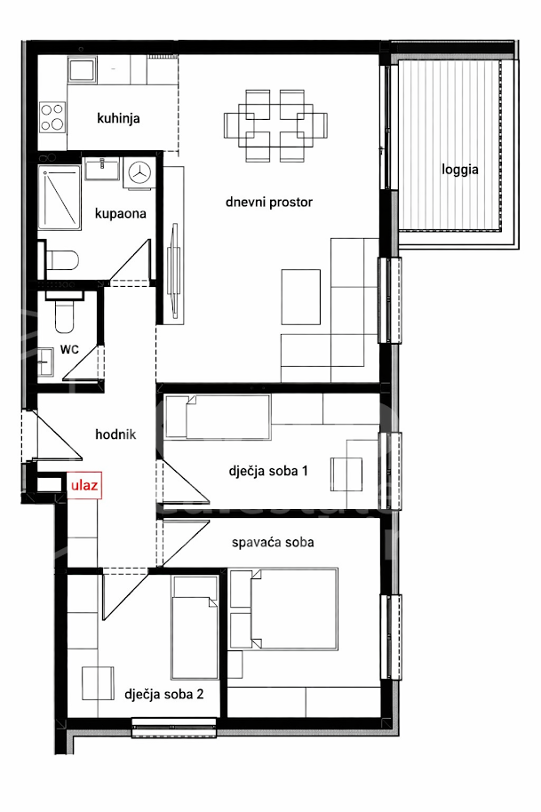 Na prikazanom tlocrtu vidljiv je raspored prostorija stana koji se sastoji od: