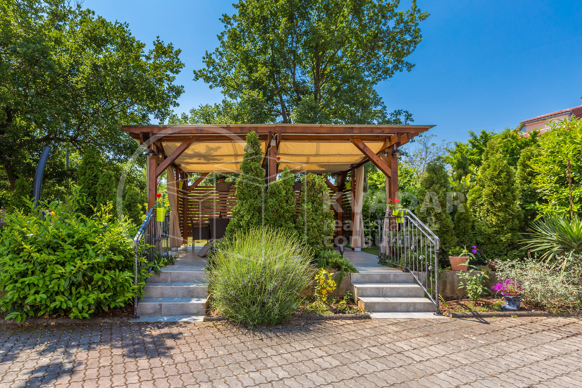 The apartment includes a spacious 81 m2 terrace with a landscaped garden area, wooden pergola, and barbecue – perfect for outdoor living, social gatherings, and relaxing.