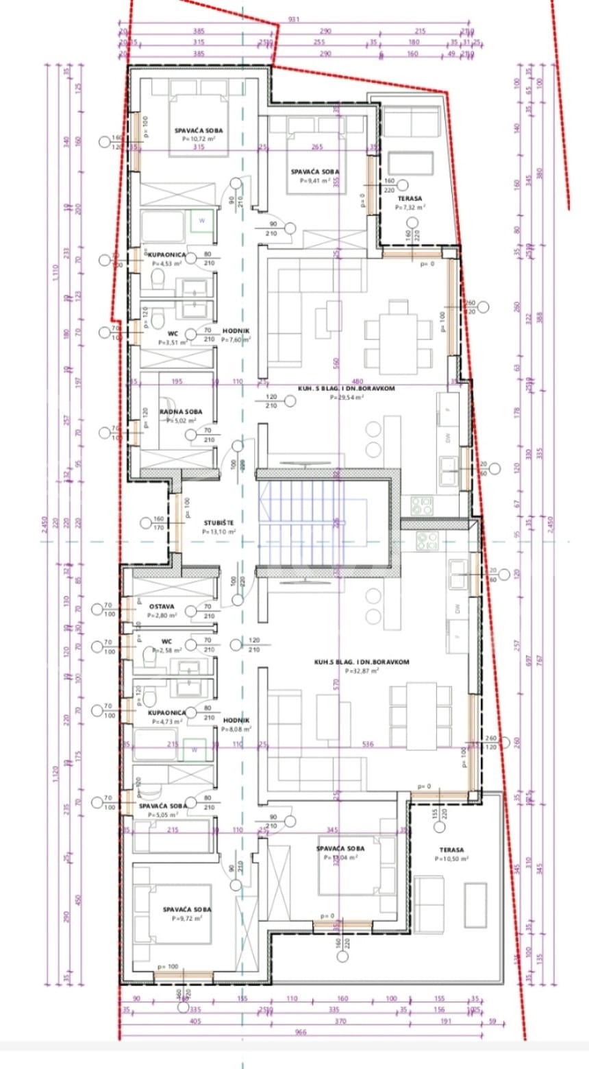 Sastoji se od hodnika, spremišta, 3 spavaće sobe, kupaonice, WC-a, kuhinje, blagavaonice i open-space dnevnog boravka,