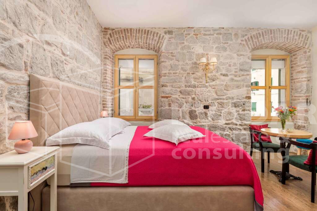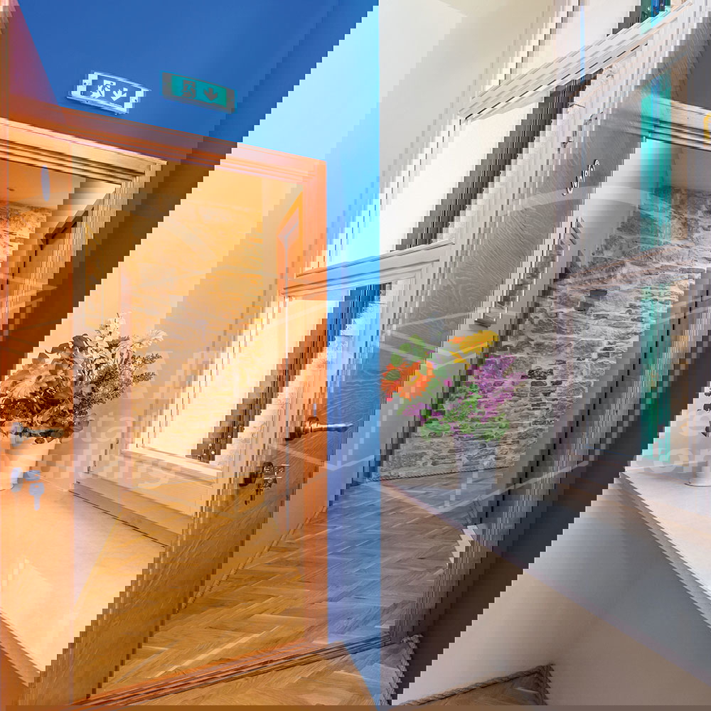 The total living area of ​​80m2 consists of 3 double bedrooms, each with its own bathroom and kitchen. The interior has been restored in an exceptionally high-quality manner, using autochthonous materials - stone and wood, respecting the strict rules of the conservator. The apartment is equipped with furniture and all the necessary devices: Android TVs, mini bar, air conditioning and Wi-Fi. in a way that combines traditional and modern style.