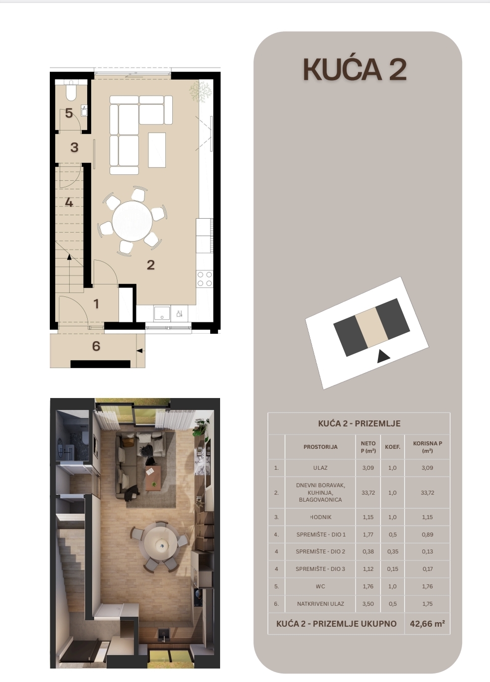 - prizemlje: open space dnevni boravak + kuhinja + blagovaonica, WC, spremište