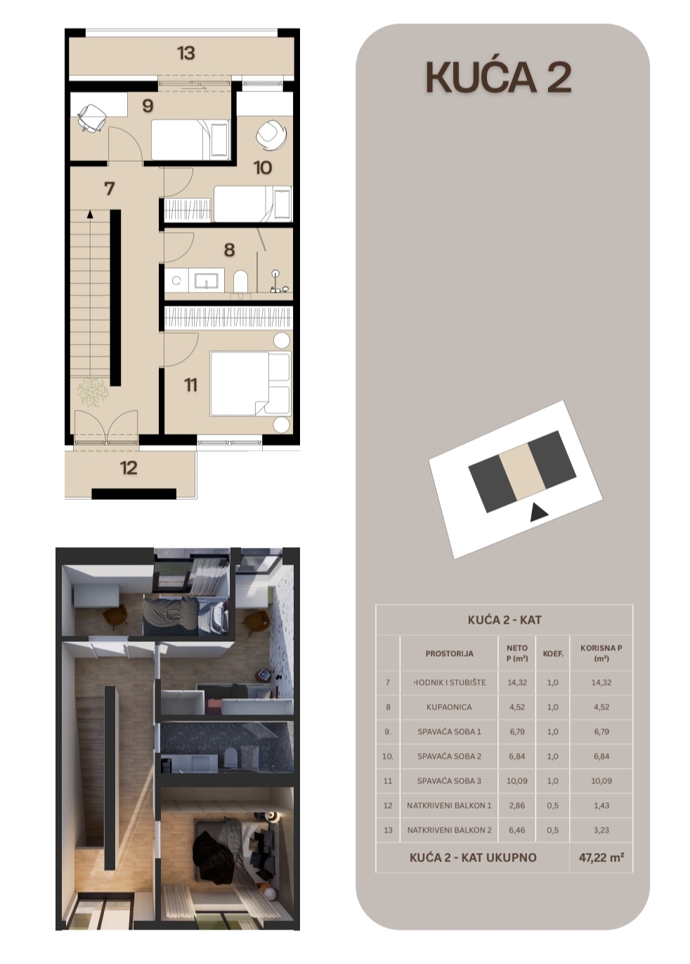 - kat: 3 spavaće sobe, kupaonica, natkriveni balkoni